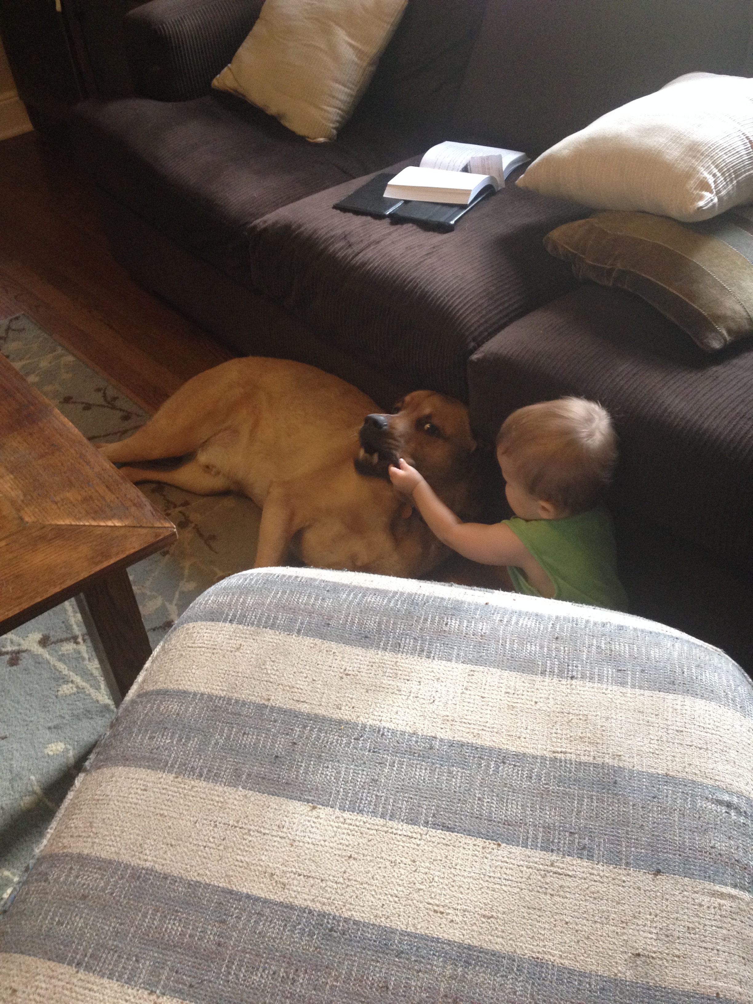I never thought that I would refer to my neurotic dog as patient. Zeb is, after all, afraid of trash cans, cameras and a variety of children’s toys. However, he also lets Noah “pet” him, which is really just slowed down hitting. He also accepts it when his tail and paws get stepped on by simply moving locations. He even lets Noah manipulate his jowls without complaint.