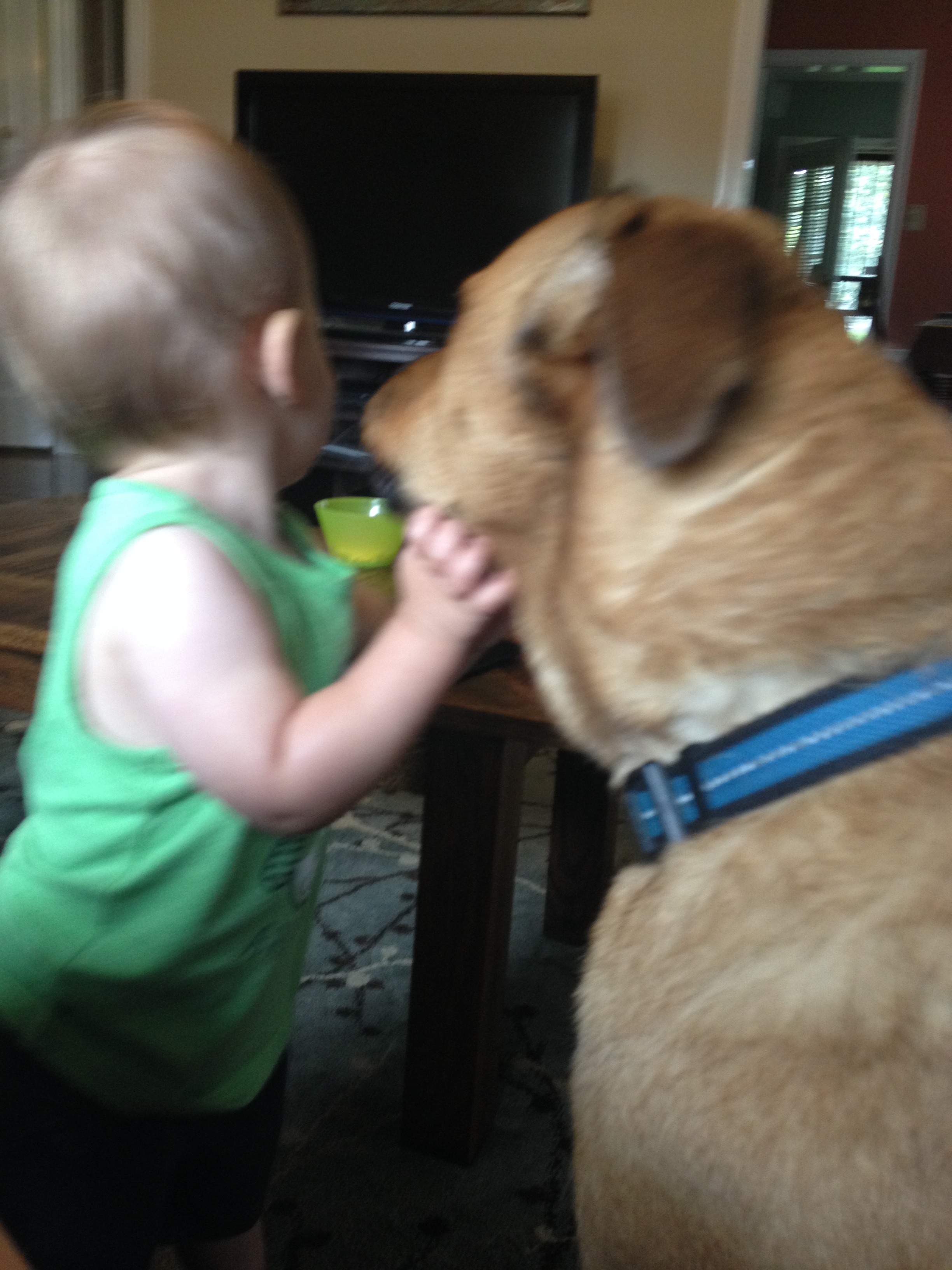 From the toddler’s point of view, his puh-puh is his beloved friend, and Noah shows his love by giving kisses. So while I may inwardly cringe at the amount of dog drool covering my boy, I’m glad to see them love each other.